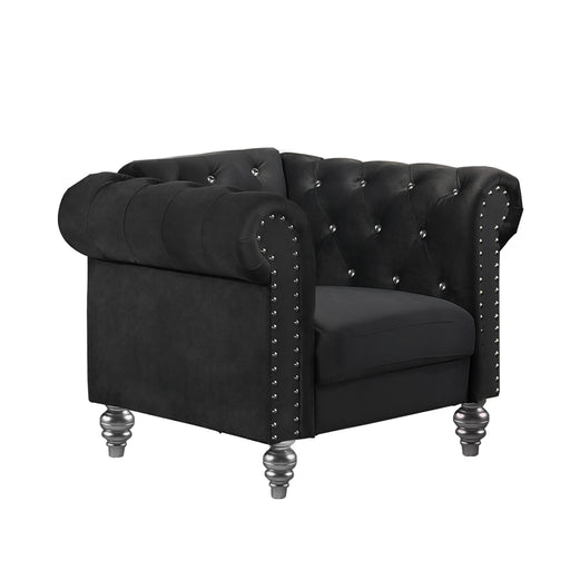 The New Classic Emma Chesterfield Velvet 2 Seat Sofa Loveseat is a blend of soft elegance and sophisticated design. Crafted from 100% polyester velvet fabric, it offers cozy and indulgent seating for two. The glam tailoring features tufted backs and arms adorned with glimmering crystal buttons, adding a touch of luxury without compromising comfort. Upscale accents, including silver nailhead trim on the rolled arms and silver turned bun feet, enhance the gray velvet fabric. Shipped unassembled for easy placement in any home, its lower profile height makes it small space-friendly, fitting well into smaller rooms while providing full-size seating. Enjoy supportive seating with full foam cushions that provide ample comfort. Add a little sparkle in your home with the Emma Loveseat.