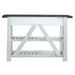 Weathered, rustic surfaces emphasize the simple beauty of everyday things. Farmhouse features a weathered white finish that looks better over time. A picnic style table generously styled to accommodate family and friends has two end leaves (18") that expand the table to 98". The classic Windsor chair known for its comfort, style, and value has simple turned legs and back spindles. Use the server in the dining room, foyer, or as a media console in the living room. This multi functional piece is 55" wide with 2 storage drawers and 2 open bottom shelves, one that accommodates wine storage. The open style server is accented with back diagonal slats to continue the farmhouse design. Add two of the leaning shelves on either side of the server to make a storage wall. The leaning shelves features 5 graduated shelves.