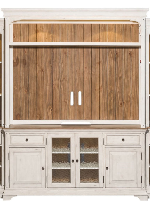 Liberty Morgan Creek 68" Entertainment TV Stand with Hutch in Antique White. Traditional Living is design that combines for a grand feel of the past with todays luxurious lifestyle. Warm antique finishes and artistic distressing along with grand scale a group to be passed to generations.